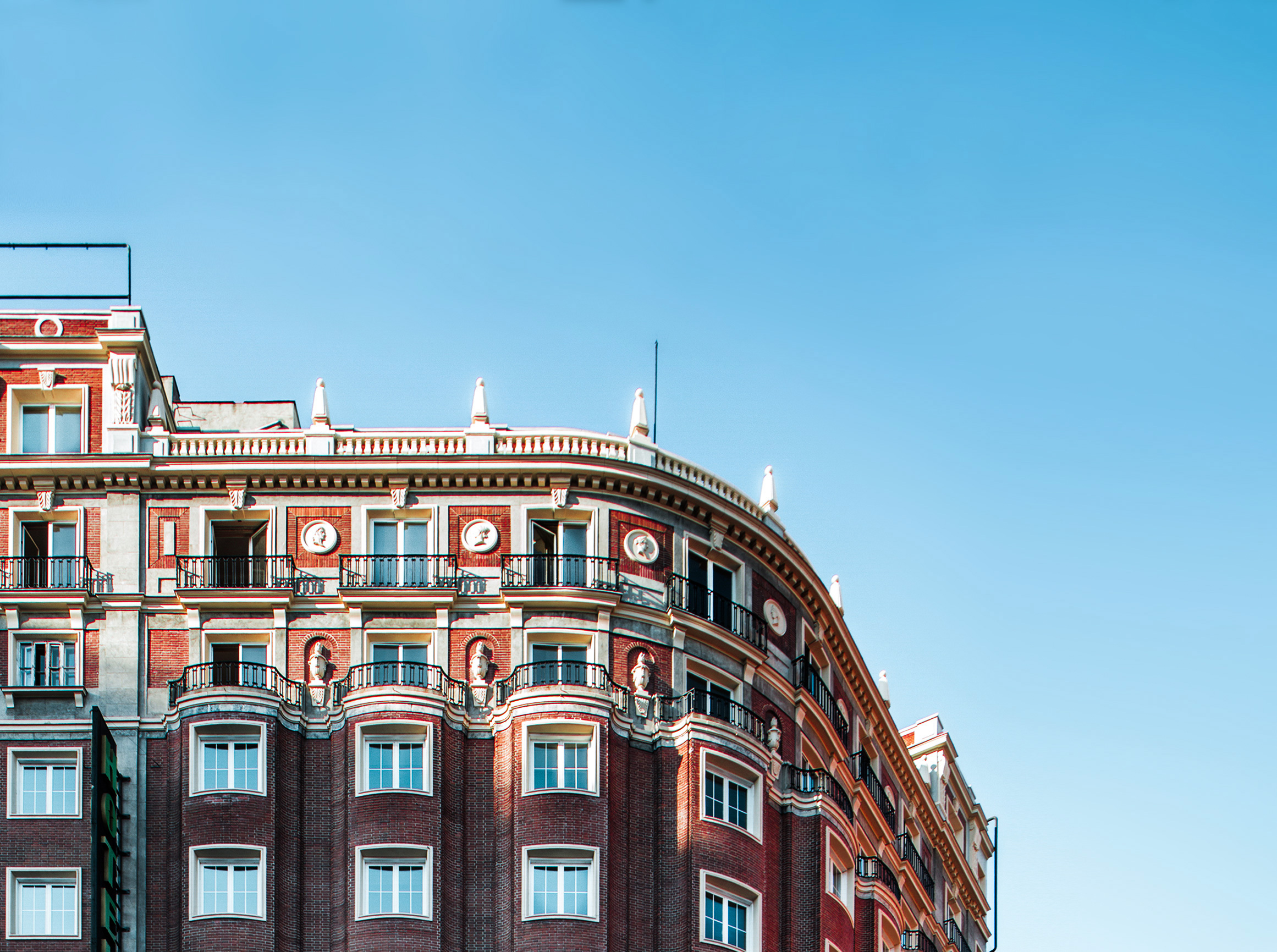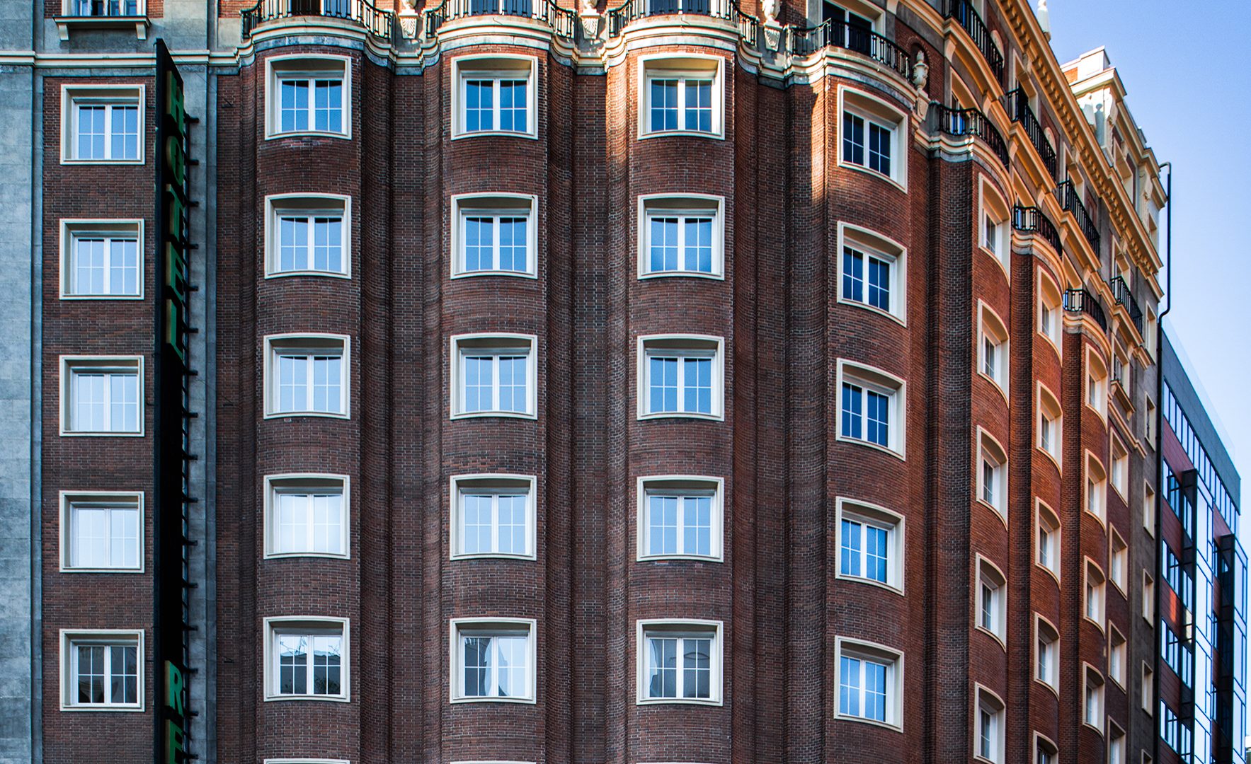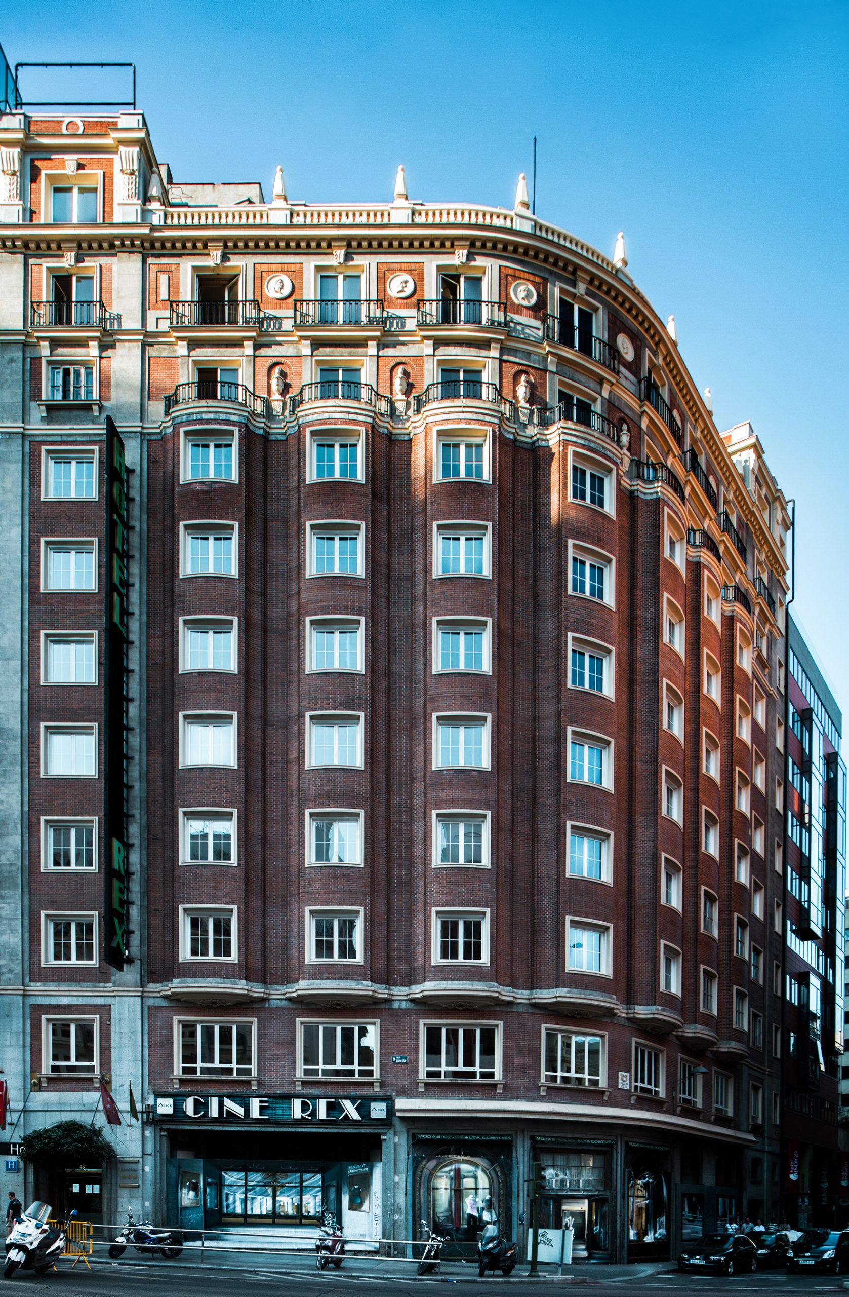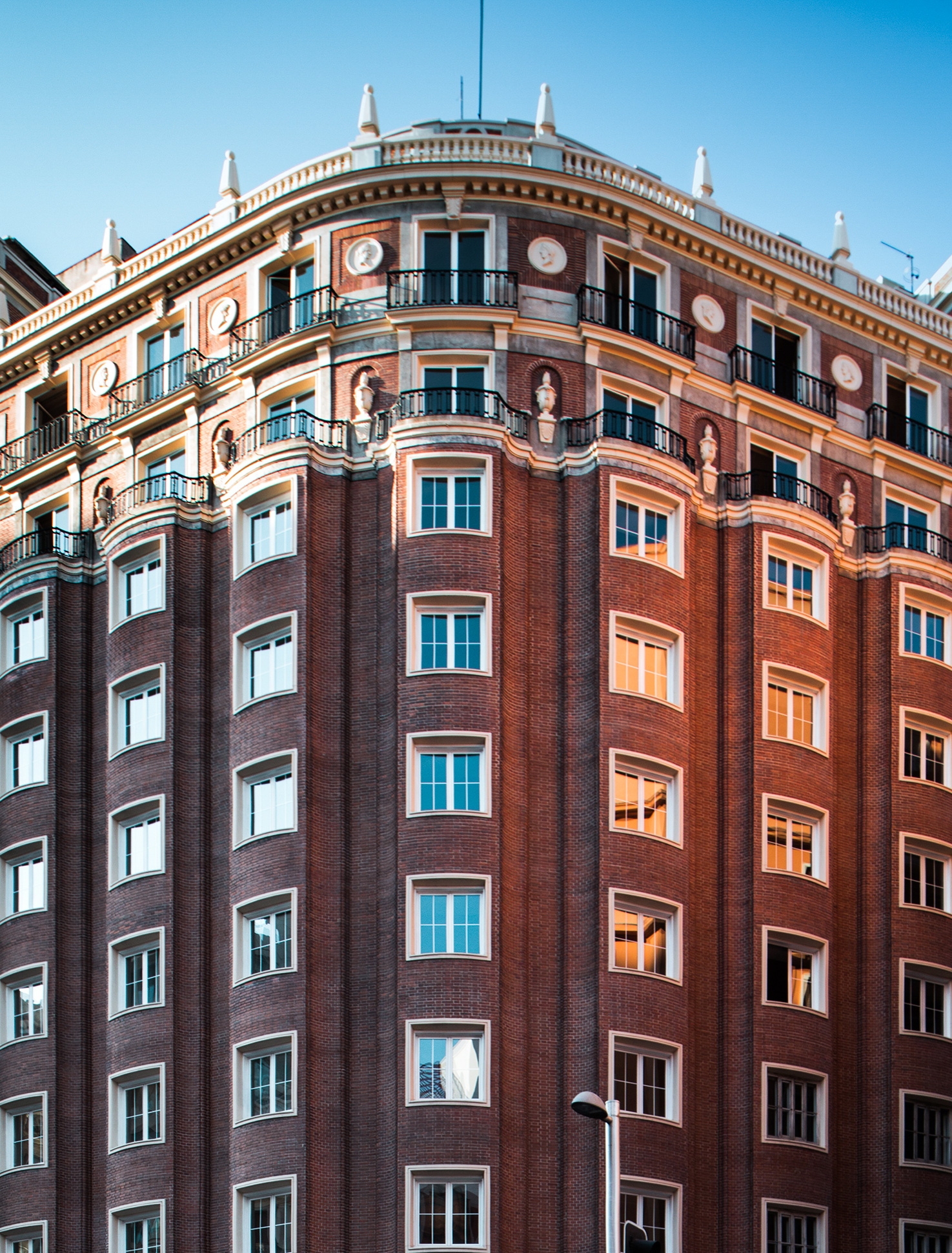 Destaca la fachada neoclásica con espectaculares motivos decorativos. Muros en ladrillo visto con una serie de miradores en forma de terrazas de hierro, separadas por hornacinas con jarrones de piedra y medallones con perfiles en bajorrelieve en su parte superior.