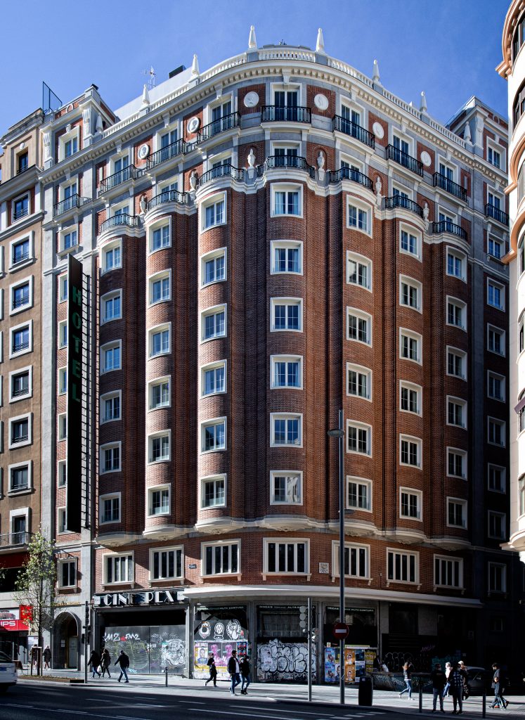 En 2016 recibimos el encargo de rehabilitar íntegramente el edificio manteniendo su uso original de hotel, a partir de un planeamiento aprobado en 2009 que integraba la sala de cine ya sin actividad en el espacio de hotel.